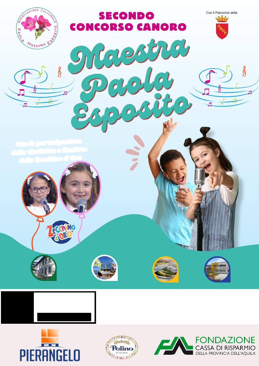 SULMONA - "L'Associazione Culturale Maestra Paola indice il "Secondo concorso canoro" patrocinato dal Comune di Sulmona, riservato agli studenti delle scuole primarie del circondario; si svolgerà il 20 maggio alle ore 18, presso il Cinema Pacifico di Sulmona. Ospiti speciali dell'evento la vincitrice dello Zecchino d'oro Mariapaola Chiummo, e la finalista Susanna Marchetti, che delizieranno il pubblico con le loro melodiose voci. Parteciperanno le scuole primarie dei seguenti comuni: