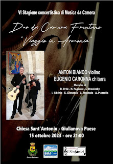 GIULIANOVA - "Il duo “Viaggio in armonia”, formato da Anton Bianco al violino ed Eugenio Caronna alla chitarra, si esibirà domenica prossima, 15 ottobre, alle 21, nella chiesa di Sant’Antonio. Il concerto, patrocinato dal Comune di Giulianova, è organizzato, con il contributo del Bim, dall’ Associazione Concertistica Orchestrale I Sinfonici e dall’ Associazione culturale “Gaetano Braga”.Bianco e Caronna, musicisti di fama nazionale e internazionale, eseguiranno musiche di Ortiz, Paganini, Stravinsky, Albeniz, Granados, Machado e Piazzolla.Il duo “Viaggio in Armonia” ha deciso nel 2012 di intraprendere un percorso musicale capace di valorizzare brani poco noti, reinterpretando un repertorio di assoluto valore, spesso secolare.