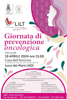 LUCO DEI MARSI - "Informazione e salute, tutto pronto a Luco dei Marsi per la Giornata di prevenzione oncologica dedicata alle donne, in programma per venerdì, 19 aprile, alle 15.00, nella Casa dell'Amicizia, in via Alessandro Torlonia. L'incontro, organizzato dall'Amministrazione comunale in sinergia con la Lega Italiana per la Lotta contro i Tumori e con la partecipazione della Consulta delle Donne del Comune di Luco dei Marsi, si svilupperà attorno al tema: "Prevenzione e diagnosi precoce del tumore della mammella", focus a cura del dottor Antonio Addari, chirurgo senologo e presidente provinciale LILT, che informerà la platea su dati, strumenti, elementi rilevanti e metodi per la prevenzione e sulle buone pratiche per la cura della salute femminile. A seguire, saranno svolte le visite senologiche gratuite, con ecografia, a cura del dottor Addari e della dottoressa Maria Filice. “É un’iniziativa che abbiamo voluto fortemente, la prevenzione è preziosa in ogni ambito e in alcuni in particolare può fare davvero la differenza”, sottolinea la sindaca Marivera De Rosa, “Sapere quali sono i segnali precoci che ci indicano che qualcosa nel nostro corpo non va, e quali sono gli strumenti a disposizione in tal caso per agire tempestivamente, può salvarci la vita. Ringrazio di cuore il dottor Antonio Addari e la dottoressa Maria Filice per la disponibilità e professionalità di sempre e la la LILT che da anni conduce una preziosa opera per la consapevolezza e la prevenzione. Le visite saranno svolte nel maggior numero possibile, altre potranno essere riprogrammate direttamente con i medici presenti, invito tutte le concittadine a partecipare e a diffondere l’invito”.