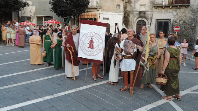 Ciascun gruppo è seguito da famiglie nobiliari: le donne indossando tunica e stola; gli uomini avvolti nella toga trabea dei cavalieri; i ragazzi in tunichette variopinte. Percorsa la Via Italica, mentre i guerrieri, insieme alle famiglie dei notabili, si schierano, il gruppo sacerdotale raggiunge l'ara, predisposta su uno dei maestosi ruderi rimasti a testimoniare l'antica grandezza.