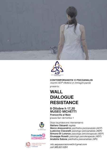 FRANCAVILLA AL MARE - "Mercoledì 9 ottobre, per la serie incontri AEP riflettere in immagini-parole - CONTEMPORANEITà E PSICOANALISI, con il patrocinio del Comune di Francavilla e dell'Ordine delle Psicologhe e degli Psicologi d'Abruzzo, AEP - Associazione Esplorazioni Psicoanalitiche, presenta Wall Dialogue Resistance del regista Stefano Odoardi, docufilm e resoconto insieme giornalistico e artistico in immagini e parole di un viaggio durato cinque settimane attraverso l'Europa, indagando il tema del «muro» come elemento di ostacolo e di opportunità, da cui prenderà spunto una tavola rotonda tra esperti e pubblico su argomenti quali l'immigrazione, le disparità di genere, le disuguaglianze sociali e il bisogno di immaginazione come strumento di cambiamento.«Abbiamo bisogno di pensare», afferma lo psichiatra e psicoanalista AEP, Marco Alessandrini, «in un tempo che confonde e che non pensa: vogliamo un pensiero che nasca da emozioni, immagini e parole che tocchino il nostro inconscio, affinché paure personali e collettive, ma anche desideri e risorse, prendano forma ed indichino, per ciascuno e per la società, vie di cambiamento».