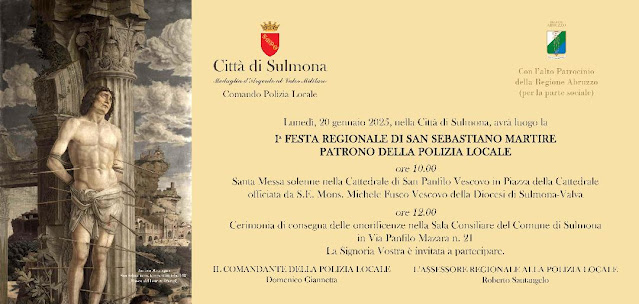 SULMONA - "La città di Sulmona è lieta di ospitare la Prima Festa Regionale della Polizia Locale, un evento, rganizzato dalla Regione Abruzzo e dal Comando Polizia Locale di Sulmona, di grande rilevanzache celebra il Santo Patrono, San Sebastiano.La manifestazione si terrà lunedì 20 gennaio 2025, con un programma ricco di momenti solenni, di riflessione e di condivisione.