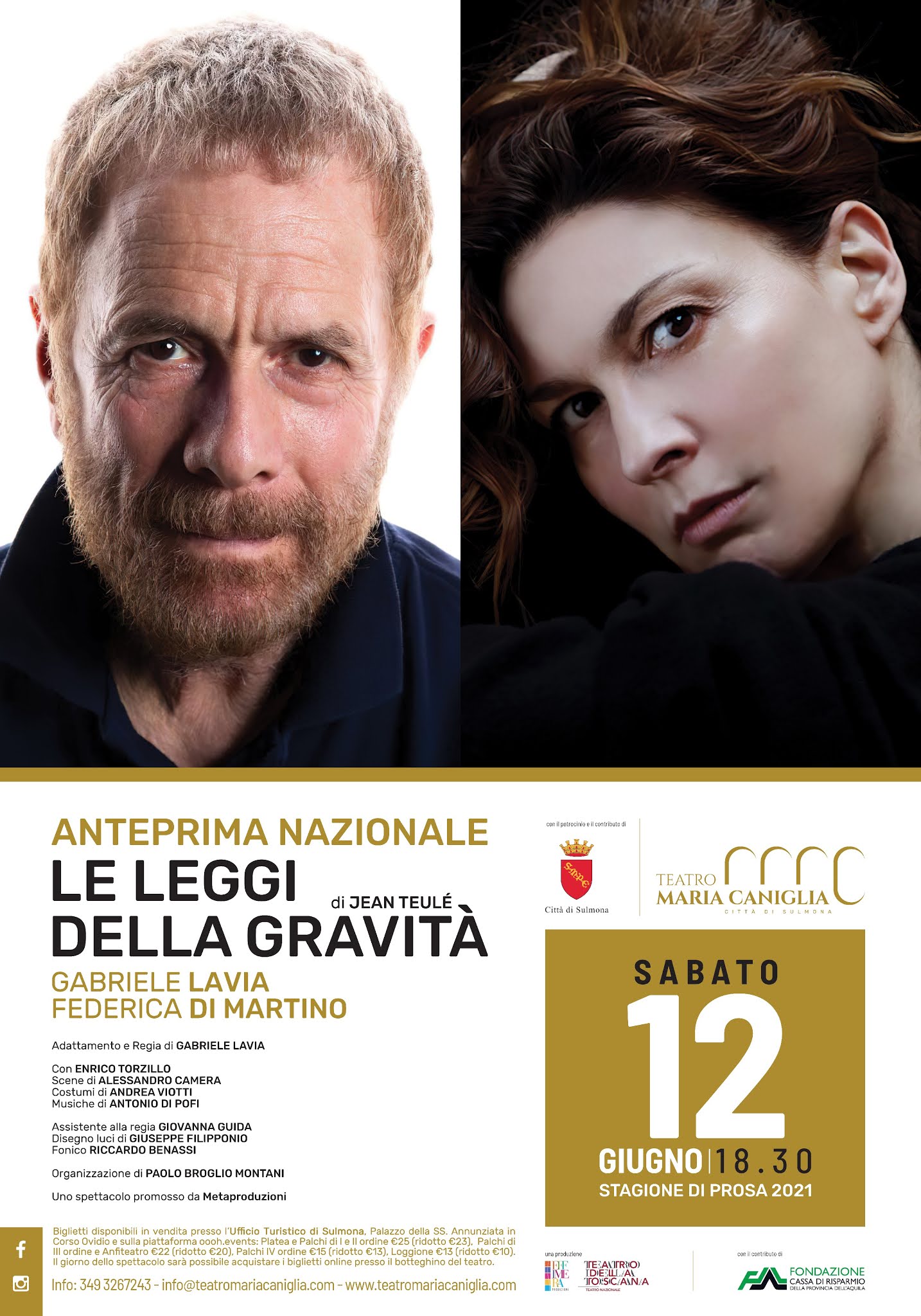 IN ANTEPRIMA NAZIONALE VA IN SCENA IL 12 GIUGNO LE LEGGI DELLA GRAVITÀ SULMONA – Sarà con uno spettacolo di grande prestigio in anteprima nazionale che il Teatro Maria Caniglia di Sulmona tornerà ad alzare il sipario, finalmente in presenza del pubblico: sabato 12 giugno 2021 alle ore 18:30 andrà in scena Le leggi della gravità, la nuova produzione di Effimera Srl in coproduzione con il Teatro della Toscana- Teatro Nazionale, con Gabriele Lavia, che firma anche la regia, Federica Di Martino ed Enrico Torzillo.Tratto dal romanzo di Jean Teulé, adattato da Gabriele Lavia, Le leggi della gravità narra la vicenda di una donna che una notte fredda e tempestosa si reca in commissariato per confessare l’omicidio del marito violento, caso avvenuto dieci anni prima e all’epoca archiviato come suicidio: l’uomo si era gettato dell’undicesimo piano del palazzo. Manca poco più di un’ora allo scadere dei termini per la riapertura del caso e solo ora la donna afferma di averlo spinto lei stessa giù dal balcone. Una congiuntura spazio temporale in cui prendono forma due leggi di gravità diverse, quella fisica di 9,81 m/s, che porta un corpo in caduta libera a schiantarsi al suolo, e quella metafisica, non misurabile eppure così tangibile: la caduta delle coscienze dentro i fallimenti delle proprie vite.