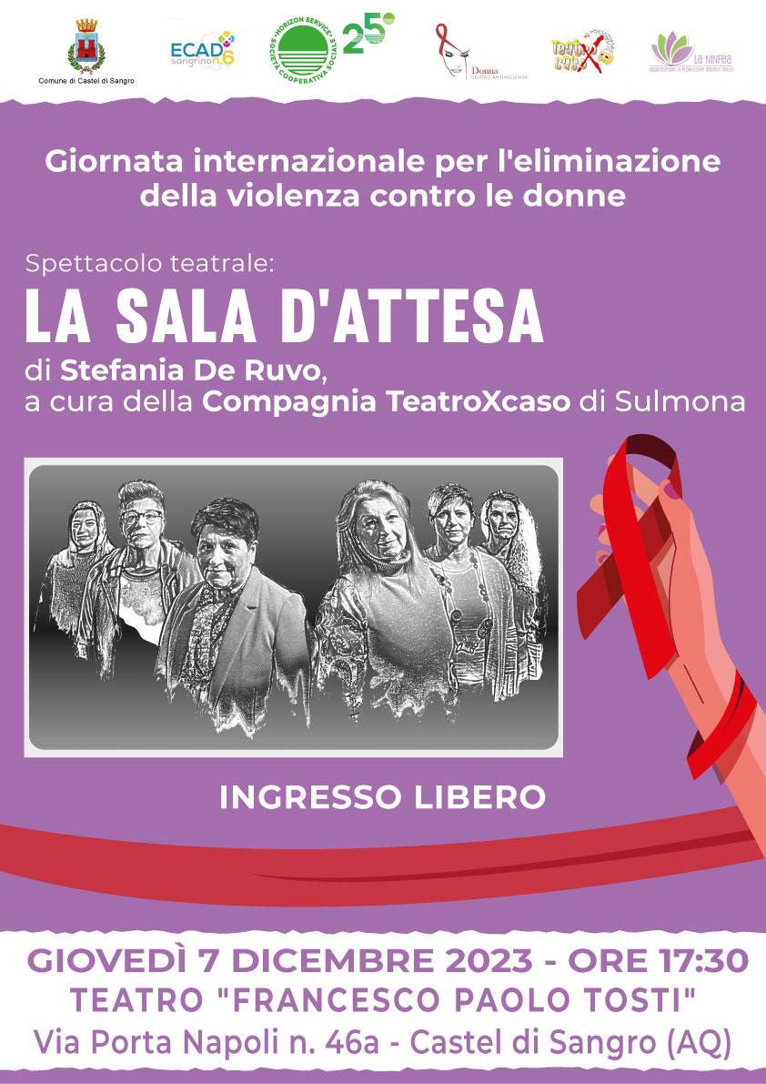 CASTEL DI SANGRO - "Giovedì 7 dicembre 2023 alle ore 17:30 presso il Teatro F. P. Tosti di Castel di Sangro si terrà lo spettacolo teatrale “La sala d’attesa”, testo scritto da Stefania De Ruvo e interpretato dalla Compagnia Teatroxcaso Sulmona di Sulmona.L'iniziativa rientra nel programma delle attività organizzato dal Comune di Castel di Sangro, dalla Horizon Service SCS e dal Centro Antiviolenza "Donna" - Castel di Sangro in occasione della Giornata internazionale per l'eliminazione della violenza sulle donne e che segue la proiezione pubblica del documentario "La casa viola", avvenuta lo scorso 25 novembre alla presenza dei registi e della rete territoriale.La pièce teatrale, che viene proposta dopo il grande successo di pubblico dello scorso anno a Sulmona, parla di violenza di genere e si struttura in dialoghi e monologhi che riguardano storie di donne diverse che vanno a formare un’unica successione, perché tutte le storie di violenza hanno caratteristiche comuni. La sala d’attesa è uno spazio particolare e indeterminato dove un gruppo eterogeneo di donne si ritrova ad aspettare qualcosa di diverso. Tutte sono state vittime della violenza degli uomini ma non ne hanno memoria; nel processo di recupero collettivo dei loro ricordi acquisiranno la consapevolezza necessaria per lasciare finalmente la sala.