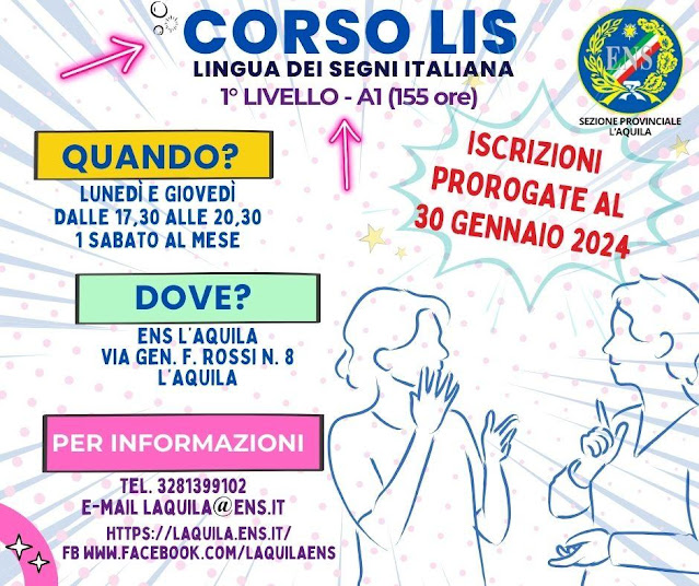 L'AQUILA - "Si ricorda che il corso di 155 ore ed è aperto a tutti coloro che vogliano conoscere il mondo e la cultura delle persone sorde e si terrà nei giorni di lunedì e giovedì dalle ore 17,30 alle 20,30.Il corso proposto dalla Sezione ENS dell’Aquila è uno strumento importante per far conoscere e promuovere la Lingua dei Segni e la Cultura dei Sordi e per far scoprire un “nuovo” mondo, quello della disabilità uditiva, spesso vicino ma invisibile. La lingua dei Segni Italiana, il cui acronimo è LIS, è la lingua utilizzata nel territorio italiano da parte dei componenti della comunità sorda ed è veicolata attraverso il canale visivo-gestuale. Come ogni lingua ha delle proprie regole, sintassi e grammatica.