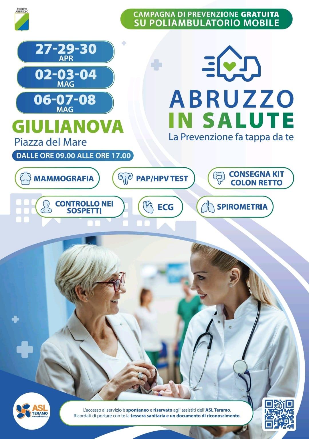 GIULIANOVA - "Arriva a Giulianova sabato prossimo, 27 aprile, il camper della campagna di prevenzione gratuita “Abruzzo in Salute”. Il poliambutorio mobile sosterà in piazza del Mare, esclusi i festivi, fino all’ 8 maggio.Sosterà dal 27 aprile all’ 8 maggio, in piazza del Mare, il camper medico attrezzato attraverso cui la Regione sta portando avanti la campagna di prevenzione gratuita “Abruzzo in salute”. A Giulianova il poliambulatorio mobile sosterà il 27, 29 e 30 aprile; il 6, il 7, l’8 maggio. Le equipe messe a disposizione dalla Regione effettueranno gratuitamente la mammografia ( esame, questo, rivolto a donne dai 50 ai 69 anni), il Pap/HPV Test, la consegna Kit colon retto, il controllo dei nei sospetti, l’ ecocardiografia e la spirometria.Il servizio, gestito dalla Regione Abruzzo e riservato agli assistiti della Asl di Teramo, sarà a disposizione dalle 9 alle 17 dei giorni indicati. Non è necessaria la prenotazione e, fatta eccezione per la mammografia, non ci sono limiti di età. E’ necessario avere con sé la tessera sanitaria ed un documento di riconoscimento.“ Il Comune di Giulianova – commenta il Vice Sindaco – ringrazia la Regione Abruzzo e la Asl di Teramo. Si tratta di un’iniziativa sempre molto utilizzata dai cittadini, un prezioso strumento per educare alla prevenzione ed alleggerire le liste d’attesa, favorendo il miglioramento dell’assistenza sanitaria ed il supporto dei servizi ospedalieri”.