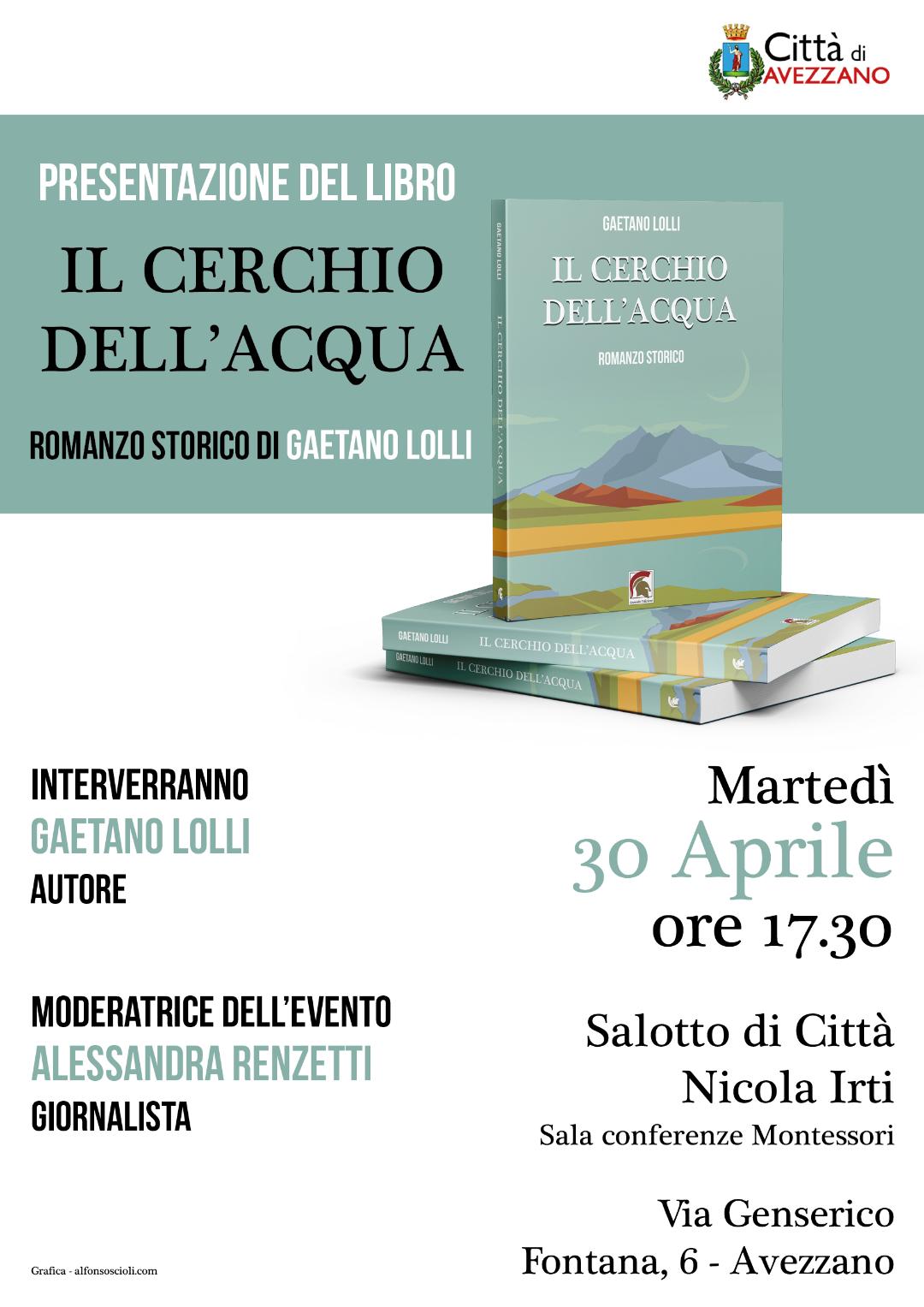 AVEZZANO - "Proprio da lì dove tutto è iniziato prosegue il suo percorso la storia del lago del Fucino, protagonista del primo romanzo storico fresco di stampa di Gaetano Lolli per Leonida Edizioni dal titolo "Il cerchio dell'acqua" e che verrà presentato alla martedì 30 aprile alle ore 17.30 presso il Salotto di Città "Nicola Irti", Sala conferenze Montessori ad Avezzano (via Genserico Fontana 6 - Aq): si tratta della storia millenaria di un’immensa distesa d’acqua «simile ad un mare per la sua grandezza», attraverso le vicende che videro l’uomo confrontarsi, specchiarsi, perdersi in quello che oggi all'uomo è dato soltanto immaginare. Modera l'appuntamento la giornalista pescarese Alessandra Renzetti."Mi presento, sono il Fucino, altro non importa aggiungere. La mia è una storia millenaria, iniziata nei meandri del tempo, ma posso dirvi questo: tutto ciò che di rilevante mi riguarda ha a che fare con l’uomo" – recita il prologo in cui è lo stesso Fucino che parla.