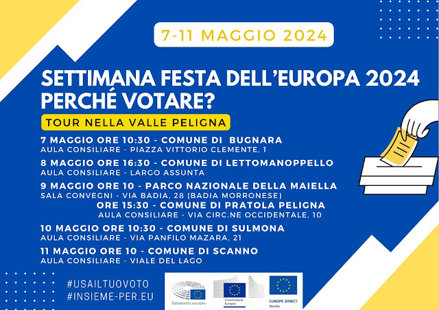 SULMONA - "Per celebrarla al meglio lo Europe Direct Maiella organizza, durante la settimana dedicata a questo importante evento, 6 incontri presso gli Enti locali che hanno aderito all'iniziativa! Durante le giornate informative si parlerà delle Elezioni Europee previste in Italia per l'8-9 giugno, con focus sul perché è importante andare a votare, quali sono le modalità per votare, chi si può votare e chi si può candidare. Vedremo, inoltre, come sono eletti i membri del Parlamento europeo e quali sono le sue funzioni. Oltre alle amministrazioni e alla cittadinanza locale, parteciperanno anche gli studenti di Istituto di Istruzione Superiore "Ovidio" Sulmona, Istituto Agrario "Arrigo Serpieri" - Pratola Peligna e Alberghiero Roccaraso.