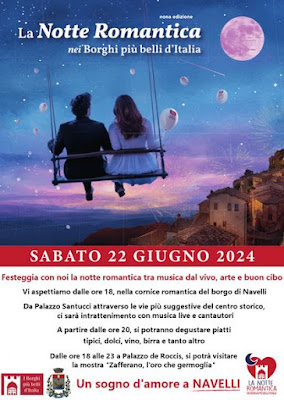 NAVELLI - "Torna la notte romantica. Appuntamento per il 22 giugno a partire dalle ore 18. Ad accogliere i visitatori ci saranno installazioni musicali, angoli per le degustazioni di prelibatezze locali e la possibilità di visitare la mostra "Zafferano l'oro che germoglia" a palazzo de Roccis e godersi il borgo.Molto suggestivo anche il percorso che si svilupperà da palazzo Santucci. "Il nostro centro storico", ha detto il sindaco di Navelli, Paolo Federico, "si presta bene ad ospitare eventi di questo tipo tanto che nelle precedenti edizioni abbiamo registrato un ottimo numero di visitatori. Quest'anno contiamo di bissare i successi delle altre annualità grazie alla particolare cura che è stata messa nella realizzazione delle installazioni. Inoltre, sono state previste degustazioni di zafferano che resta una delle spezie maggiormente legate al mondo dell'amore". La notte romantica è stata organizzata in collaborazione con l’associazione Pro Loco. L’evento che negli anni ha maturato esperienza e consapevolezza, suscita emozioni ai tanti visitatori che si recano nel borgo alle pendici del Gran Sasso.Il presidente della Pro Loco, Giuseppe Giampietri, “abbiamo voluto dare vita ad un evento unico facendo tesoro dei successi delle precedenti edizioni, proprio per dare il massimo in termini d’accoglienza e qualità ai visitatori si appresteranno a vivere l’evento".