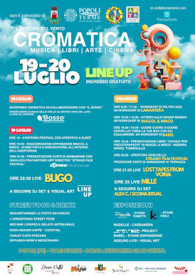 POPOLI TERME - "Torna CROMATICA. Musica|Libri|Arte|Cinema, evento organizzato dall’Associazione Culturale L’Officina del Vento con il patrocinio del Comune di Popoli Terme e APTS, in collaborazione con TermaeCordis, giunto alla sua terza edizione.Venerdì 19 e sabato 20 luglio dalle ore 19.00 si apriranno le porte del Parco Auditorium Gran Guizza (viale B. Buozzi a Popoli Terme (PE)) per trascorrere due giornate all’insegna di concerti, incontri con scrittori e registi, esposizioni grafiche e tanto altro… senza farsi mancare food & drink.CROMATICA è musica, libri, arte e cinema.CROMATICA non è una teoria, ma una pratica dei colori, che intreccia diverse forme di espressione artistica attraverso le figure di musicisti, scrittori, registi e artisti, guardando tutti i colori della cultura in ogni loro sfumatura.L’idea che muove L’Officina del Vento è quella di creare uno spazio che accolga le idee e i desideri di chiunque voglia farne parte, schiudendo un luogo in cui incontrarsi e condividere ogni passione. Infatti, con CROMATICA si apre un universo ricco di tonalità e gradazioni artistiche, che creano un’armonia densa di tinte e sfaccettature, che andrà oltre le due giornate dell’evento.