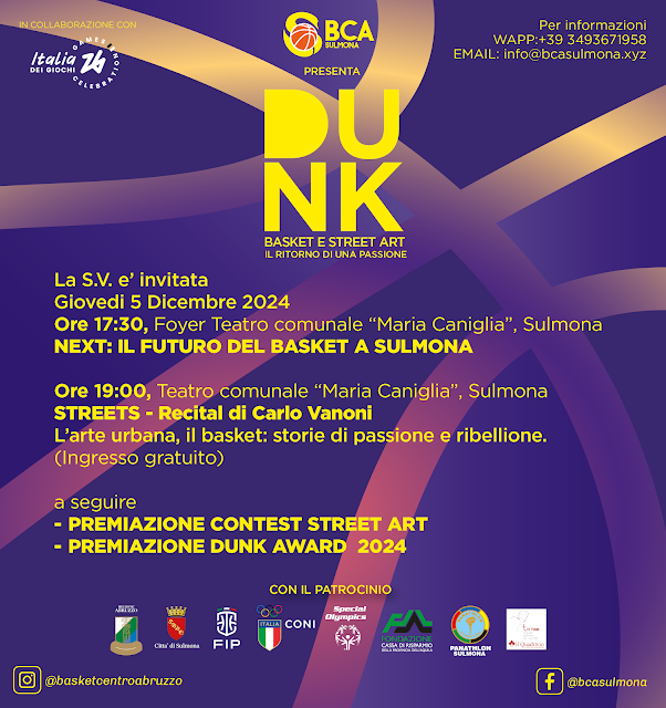 La premiazione avverrà il 5 dicembre, alle 17, nel foyer del teatro Maria Caniglia di Sulmona dove, oltre a celebrare il talento degli artisti che hanno partecipato al contest , saranno svelati alla Città i prossimi progetti legati al basket. Prima però, la mattina del 5 dicembre, nell’aula magna del liceo Mazara, Lorenzo Petrantoni, artista, illustratore e art director poliedrico e spiazzante i cui lavori sono esposti in alcune delle più importanti gallerie d’arte contemporanea del mondo e gli sono valsi premi prestigiosi tra cui V&A Illustration Awards, London International Awards, New York Festival, American Illustration, incontrerà gli studenti con i quali realizzerà un’opera. Ma non è ancora tutto. BCA attribuirà il premio DUNK AWARD 2024 ad una personalità (il cui nome sarà svelato qualche giorno prima della premiazione) che ha saputo distinguersi nel panorama del basket e dello spettacolo, diventando un vero e proprio ambasciatore del basket in Italia".