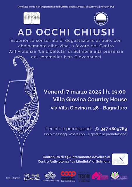 SULMONA - "In occasione della ricorrenza dell’8 marzo il Comitato per le Pari Opportunità dell’Ordine degli Avvocati di Sulmona, insieme alla Horizon Service, promuovono una iniziativa benefica a favore delle donne vittime di violenza.Venerdì 7 marzo 2025 alle ore 19:00 presso Villa Giovina Country House in via Villa Giovina n. 38 a Bagnaturo si terrà l’iniziativa “Ad occhi chiusi!”, una esperienza sensoriale di degustazione al buio, con abbinamento cibo-vino, a favore del Centro Antiviolenza “La Libellula” di Sulmona alla presenza del sommelier Ivan Giovannucci. L’iniziativa, organizzata in occasione della Giornata Internazionale della Donna dell’8 marzo, è promossa dal Comitato per le Pari Opportunità dell’Ordine degli Avvocati di Sulmona e dalla Horizon Service Società Cooperativa Sociale che gestisce il CAV “La Libellula”.
